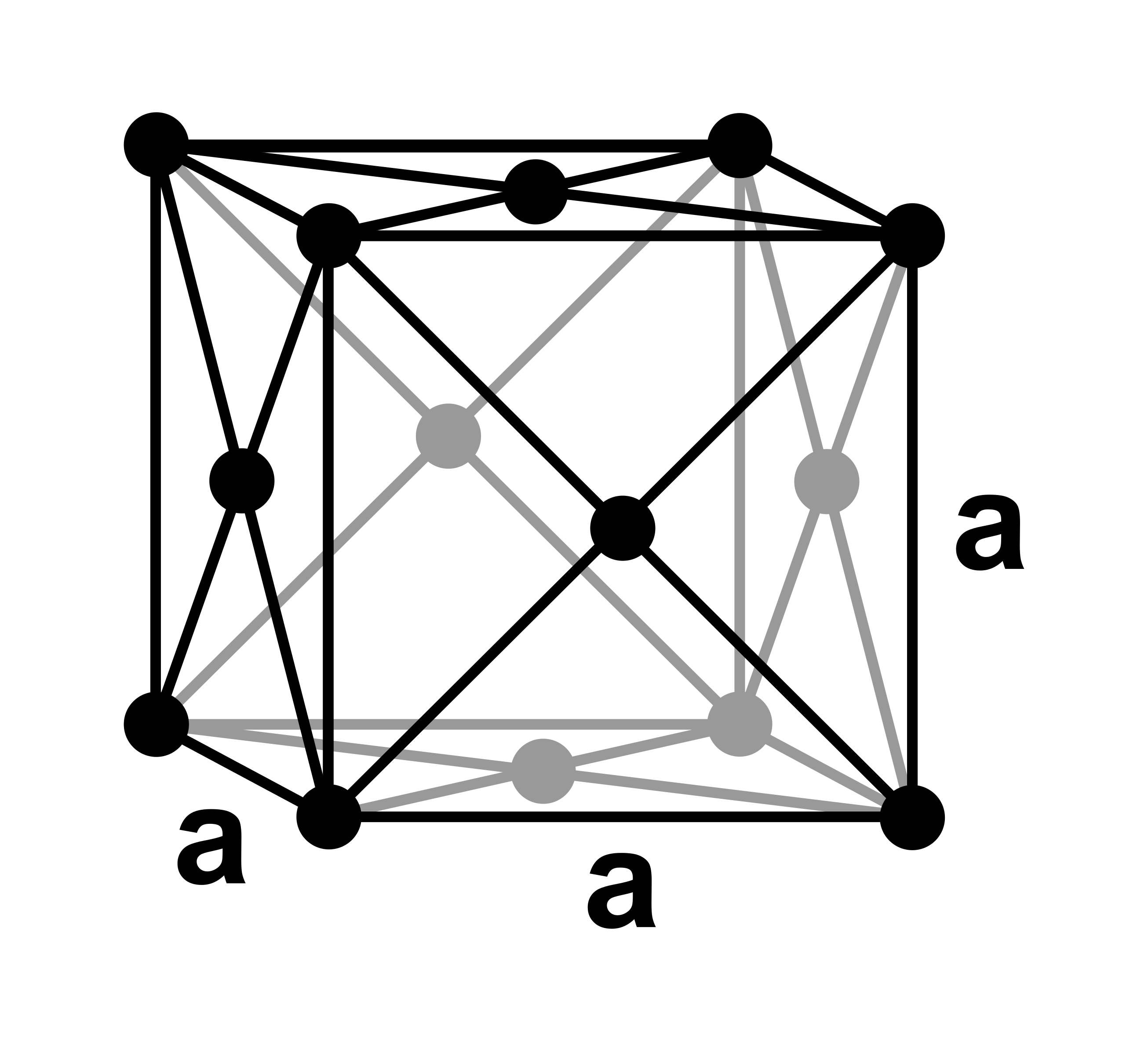 Another important lattice similar to the SC-lattice but with additional lattice points at each face of the cube. The lattice vectors are \(\vec{a_1} = (\frac{a}{2}, \frac{a}{2}, 0)\), \(\vec{a_2} = (\frac{a}{2}, 0, \frac{a}{2})\) and \(\vec{a_3} = (0, \frac{a}{2}, \frac{a}{2})\).