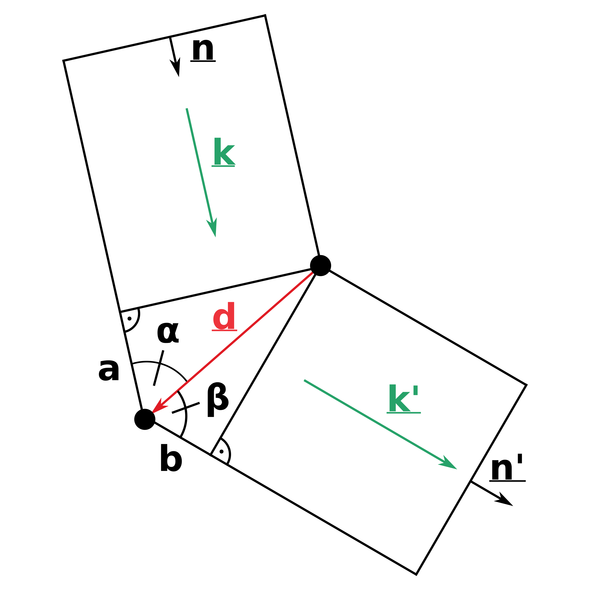 as \(\vec{d}\), \(\vec{a}\) and the plane create a right triangle. This is of course true for all lattice vectors. After multiplying by \(2\pi\) we get the following relation