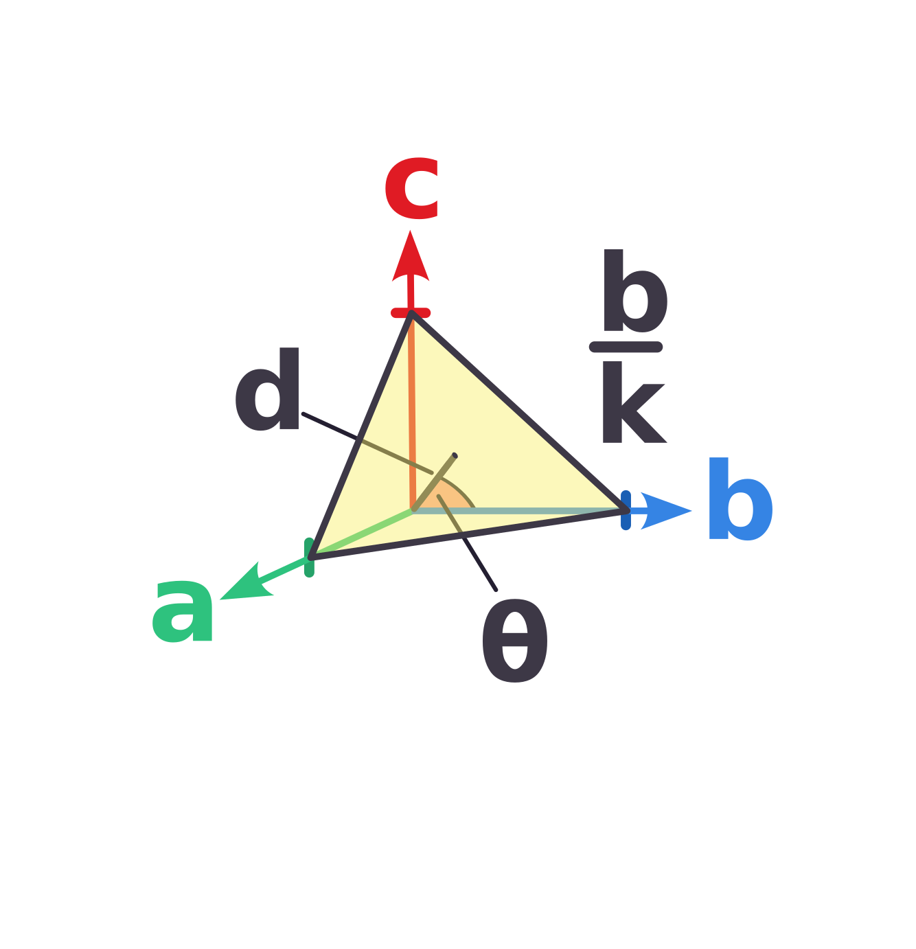 The plane then intercepts the axes at \(\frac{\vec{a}}{h}\), \(\frac{\vec{b}}{k}\) and \(\frac{\vec{c}}{l}\) and does not intercept an axis at all if the corresponding index is \(0\). We can now relate the axes intersections to the distance between the planes.