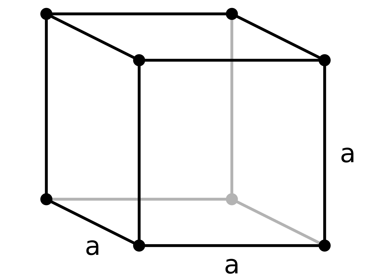 As the name suggests this lattice contains just the corners of a cube. The lattice vectors are \(\vec{a_1} = (a, 0, 0)\), \(\vec{a_2} = (0, a, 0)\) and \(\vec{a_3} = (0, 0, a)\).