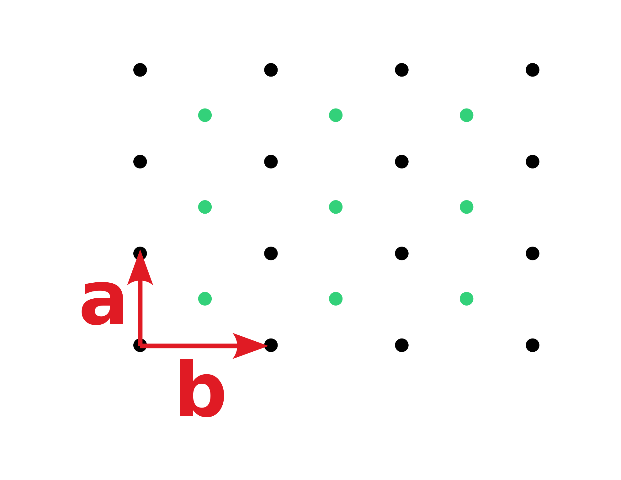 The lattice points are only points in space, to describe a structure we need to add a basis that contains the position of the atoms relative to the lattice. The basis can only contain the null-vector so that the atoms lie exactly on the lattice points. If we on the other hand had two basis vectors \(\vec{p_1} = (0, 0)\) and \(\vec{p_2} = (\frac{1}{2}, \frac{1}{2})\) we would get the following structure